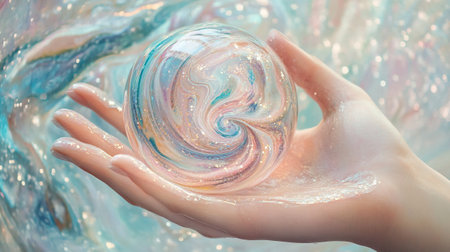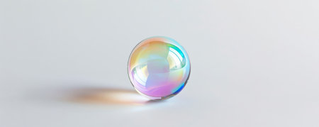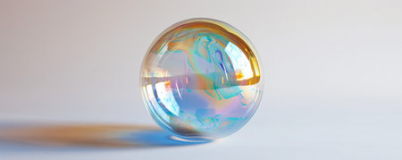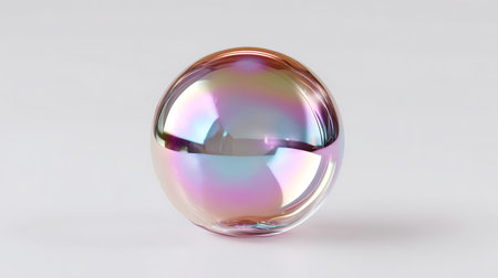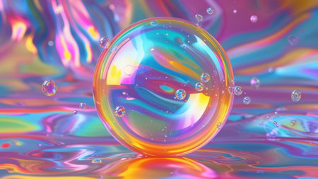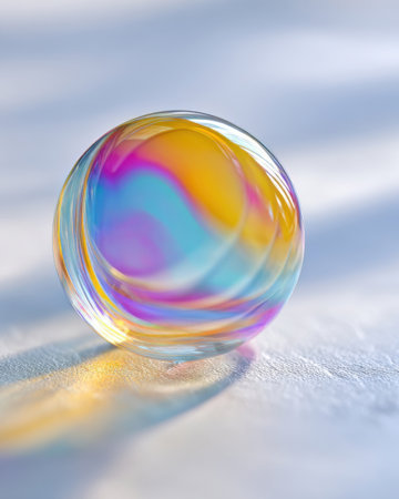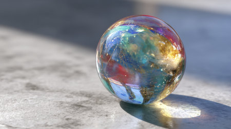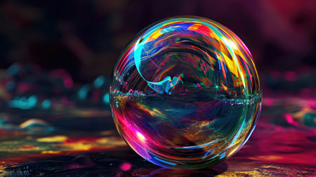 A captivating transparent sphere filled with colorful elements rests upon a shimmering surface, creating a tranquil and ethereal vibe perfect for artistic exploration.
