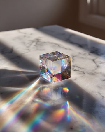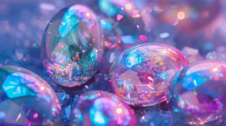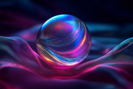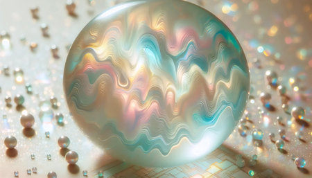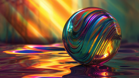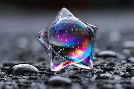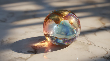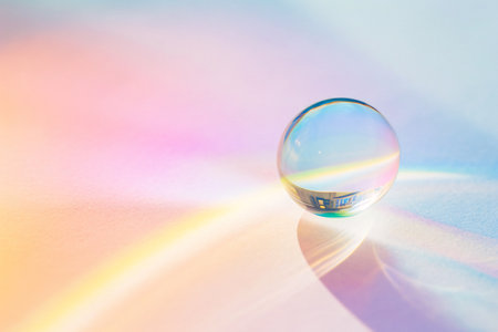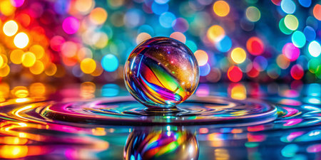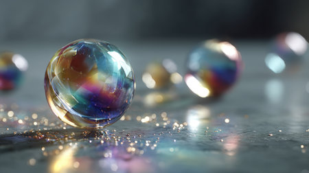 multifaceted, iridescent sphere or marble reflecting vibrant rainbow colors on wet surface scattered with glitter. The image highlights refraction, light, and fragility, creating a beautiful and mysterious background for science or business concepts.