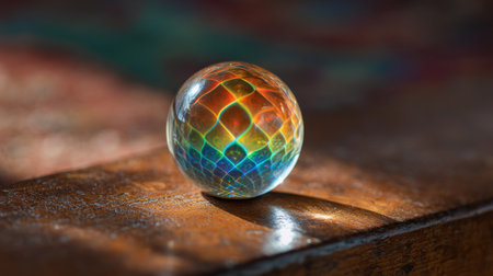A colorful glass sphere sits elegantly on a wooden surface, reflecting vibrant light and intricate patterns, creating a stunning visual display in this serene still life scene.