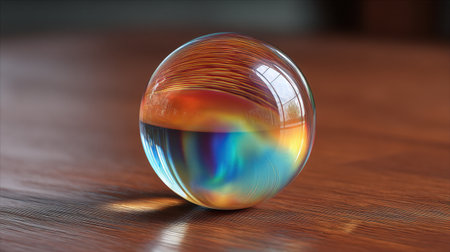 A mesmerizing glass orb is placed on a wooden surface, displaying a vibrant array of colors that capture light beautifully, perfect for design or artistic projects.