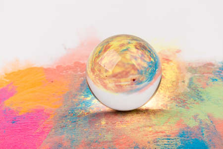 Colorful reflections in a crystal sphere on a vibrant background during evening light