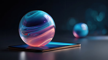 A visually striking depiction of glossy abstract spheres resting on a sleek tablet, showcasing vibrant neon colors and soft lighting that evoke a futuristic ambiance.