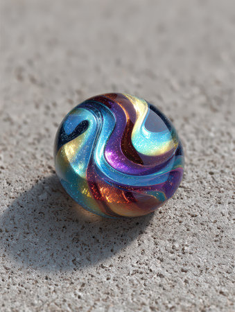 This captivating image features a colorful marble with swirling patterns resting on a smooth concrete surface. The vibrant colors and sparkle add artistic flair to any design project.