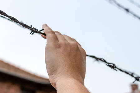 A woman's hand grasping barbed wire