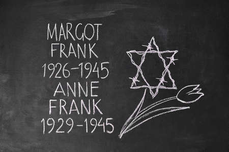 symbolic gravestone of Anne Frank and Margot Frank drawn in chalk on a blackboard