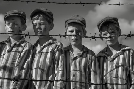 Four young boys standing behind a barbed wire fence, wearing striped clothing and caps. Represents concepts of historical events, wartime, innocence lost, and childhood in distress.