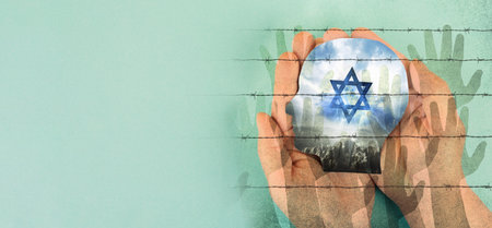 Holding face with flag of Israel, Star of David and barbed wire with hands, war between jewish and palestinians, refugees