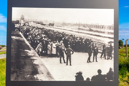 OSWIECIM, POLAND - SEPTEMBER 7, 2022: Photo Exhibition in Auschwitz II concentration camp in a sunny day, Oswiecim, Poland