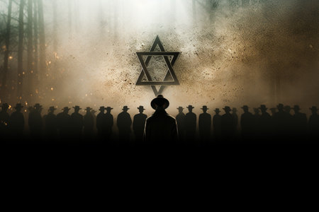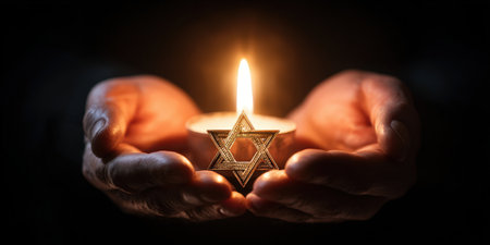 Hands gently cup a burning candle engraved with a star of david, a solemn tribute symbolizing remembrance, mourning, hope and spiritual comfort in the dark