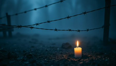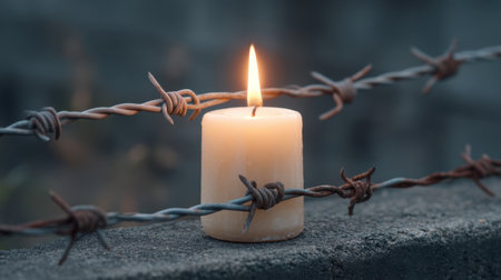 A candle placed within barbed wire represents the themes of hope and resilience. The soft glow contrasts with the harsh wire, highlighting the struggle for freedom and peace.