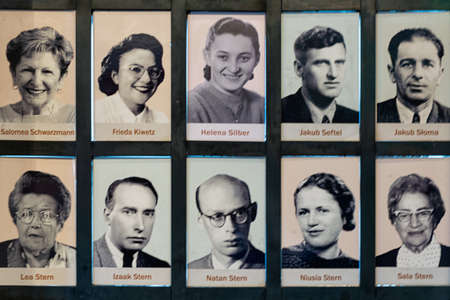 Krakow, Poland - May 16, 2019: Portraits of Jewish people saved bij Oskar Schindler. Memorial wall in Krakow Museum Schindler's Factory in WW2