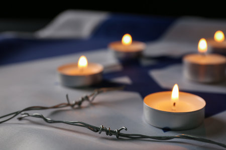 Burning candles and barbed wire on flag of Israel. Holocaust memorial day