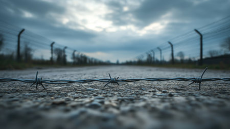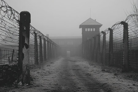 In early morning fog, an abandoned concentration camp displays a grim atmosphere. Barbed wire fences enclose the pathway leading to a guard tower, evoking a sense of history and memory of past events.