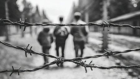 Grayscale image of people walking along a path behind a barbed wire fence. The fence is in sharp focus, while the people are slightly out of focus, creating a sense of distance and perhaps isolation. The image evokes a sense of history and confinement.