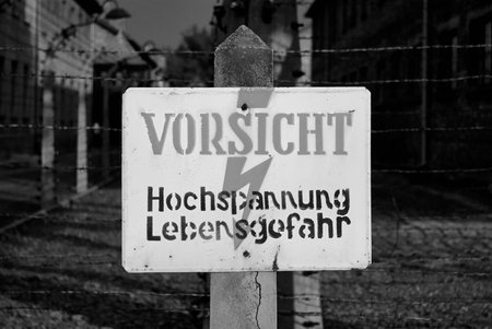 High voltage danger sign on Auschwitz barbed wire fence
