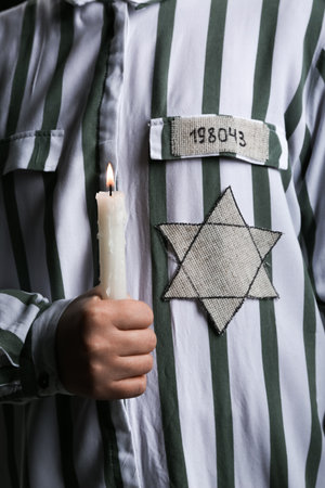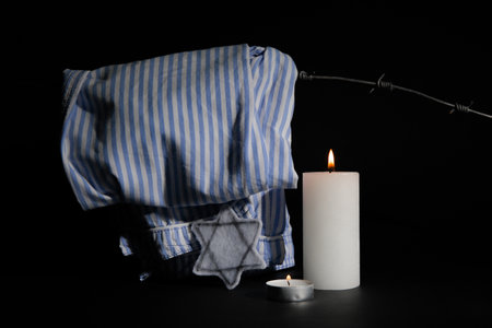 Burning candles with Jewish badge and prisoner uniform on dark background. International Holocaust Remembrance Day