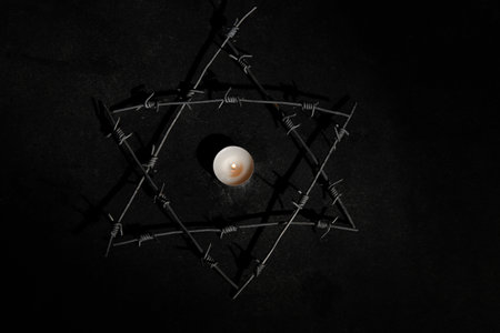 Burning candle with David star made of barbed wire on dark background. International Holocaust Remembrance Day
