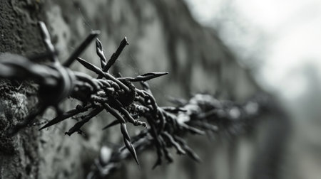 A close up of a barbed wire fence with some spikes, AI