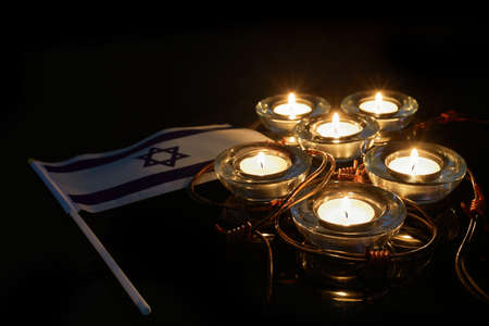Burning candles and flag of Israel on dark background. remembrance day