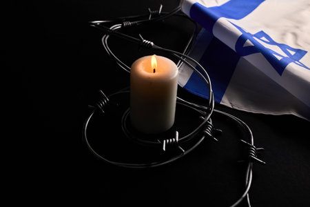 Flag of Israel, barbed wire and burning candle on black background. Holocaust memory day