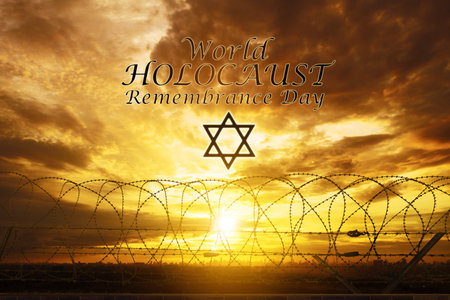 Close up of barbed wire wall with world holocaust remembrance day text with Jewish star in dusk sky background