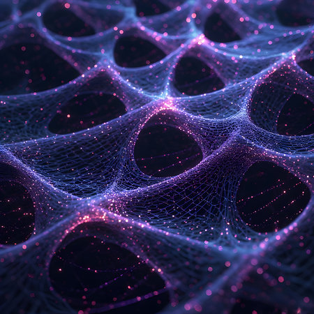 Square close-up of a delicate, fine-mesh structure in blue and magenta. Abstract, translucent rendering of complex data fabric, suitable for subtle screen backgrounds and textures.