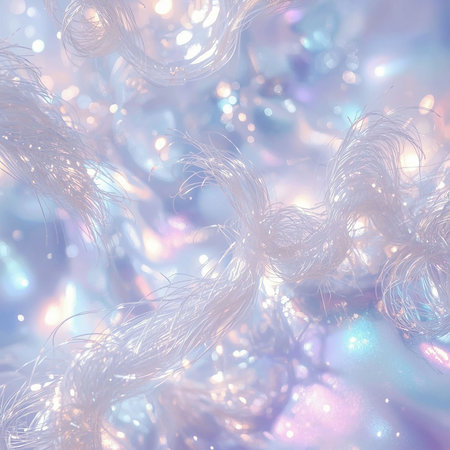 Long silver hair with holographic reflections, panoramic shot, captures the surrounding rainbow light, smooth and glossy surface