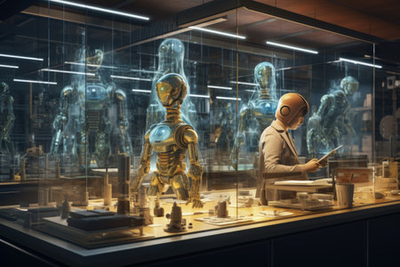 Futuristic laboratory displays humanoid robots while a scientist analyzes data, highlighting advanced technology, artificial intelligence, and innovative research