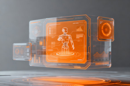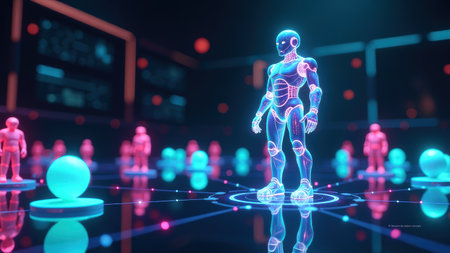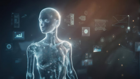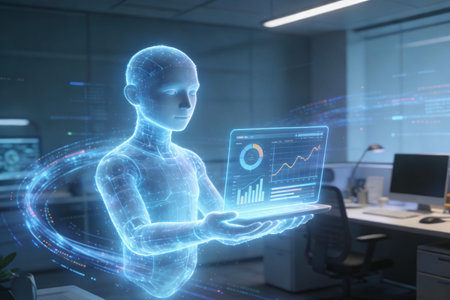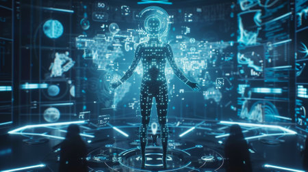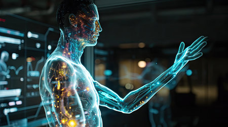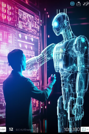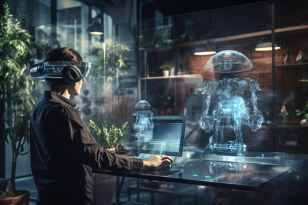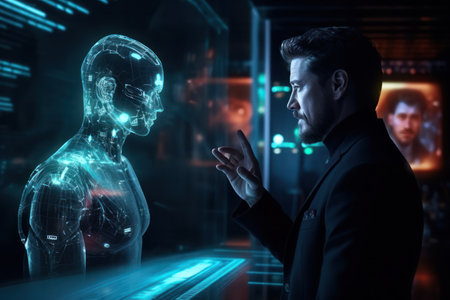 AI and human synergy: Man communicates seamlessly with holographic assistant.