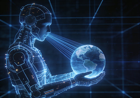 3d rendering humanoid robot holding planet earth in his hand on dark background