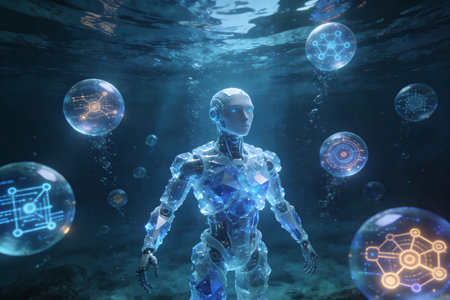 Cyborg floating in deep blue water, 3D rendering with DOF