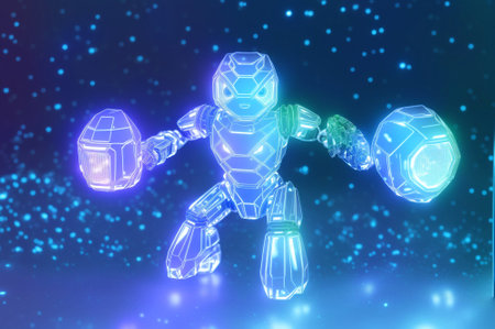 A robot with two glowing lights in its hands. The robot is in a blue background