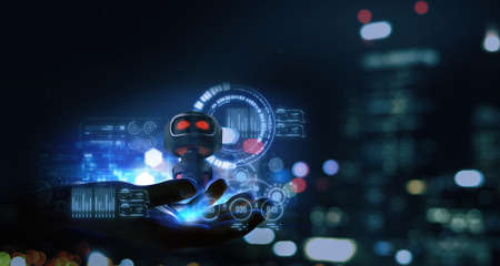 Futuristic technology and business concept - human hand with virtual mixed augmented reality robot which use technology of artificial intelligence, chatbot, digital, data transformation, 5G