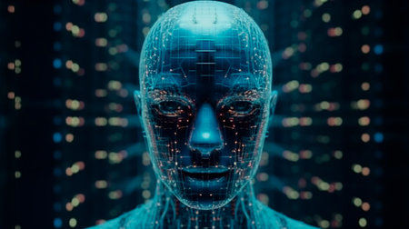 Artificial Intelligence Conscience - Existential Threat from AGI - AI Takeover Concept with Digital Face on Tech Background. Generative AI technology