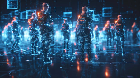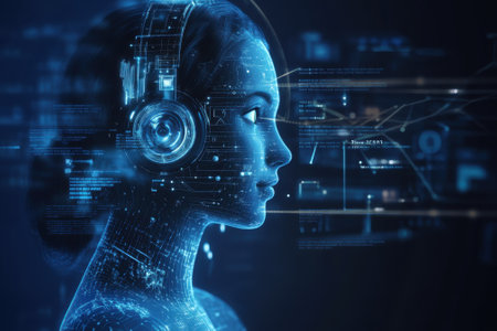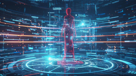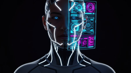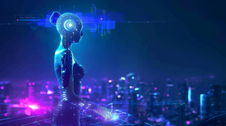 A digital artwork depicts a cyborg with a half-human, half-robotic face. The subject's form is highlighted with neon-like circuits. Displaying data, a holographic panel hovers. The artwork uses bright blues, violets, and white against a dark background. This image could be suitable for digital art, technology, or science fiction related projects.