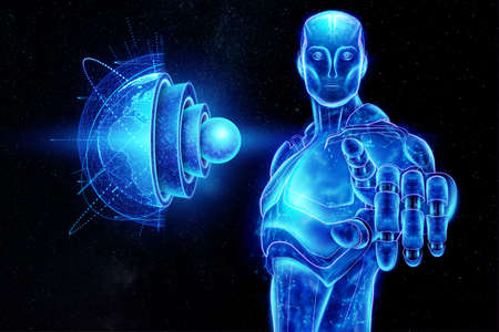 3D rendering artificial intelligence AI research of droid robot and cyborg development for future of people living. Digital data mining and machine learning technology design for computer brain.