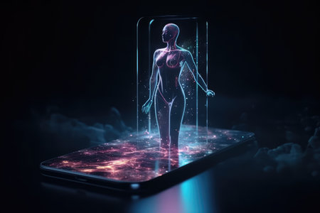 A glowing holographic human figure appears above a smartphone held by a hand. The image features a blue color scheme, digital lines, and light effects, suggesting futuristic technology. The background is a room setting with bookshelves. This visual is suitable for commercial uses related to technology and innovation.