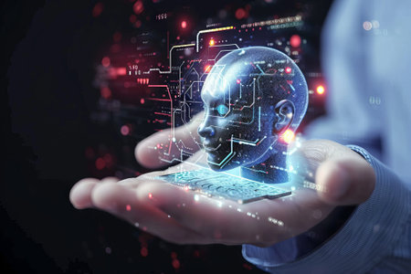 A futurist holds the manifestation of artificial intelligence in their palm, symbolizing the merging of human creativity and advanced technology.
