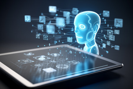 3d rendering of robot with hologram on smartphone screen over wooden table
