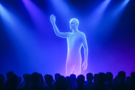 A holographic figure is waving, creating an engaging atmosphere with vibrant purple and blue lights