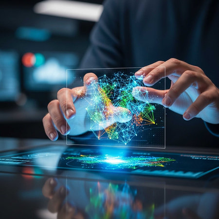 A person interacting with a futuristic digital interface displaying a vibrant network of connections and data.