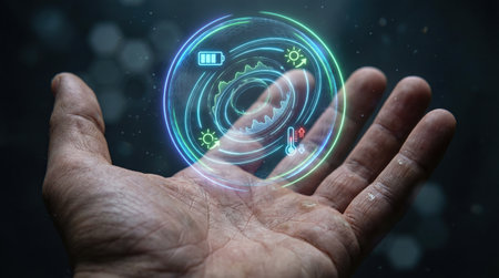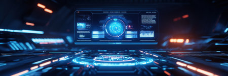 Transparent HUD interface design overlaid on blurred tech background. AI Generated.