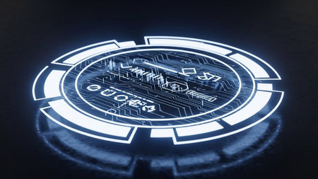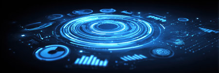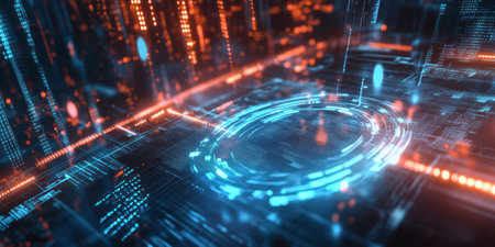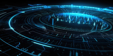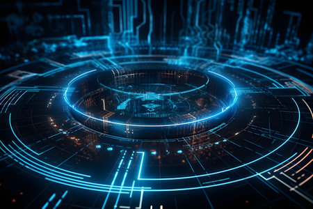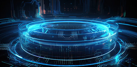 A futuristic digital interface glowing blue circuitry and geometric data visualizations against a dark, abstract background.
