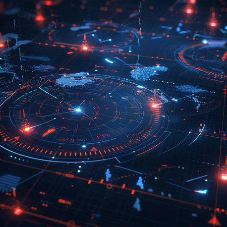A high-tech interface displaying a cyber network map with nodes, data transfer rates, and connections, symbolizing real-time data flow.