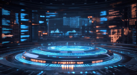 3D render of a futuristic circular platform with blue glowing lights on the top, surrounded by holographic data and charts. Futuristic tech background concept for business presentation design in the style of 3D rendering. --ar 78:43 --v 6.1 Job ID: 1ea3c676-d0b9-45bd-af69-a7c30e34007f