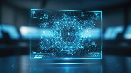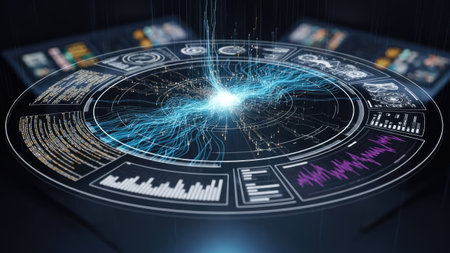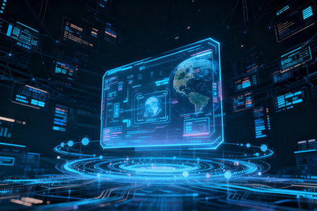 Complex display showcases a futuristic digital interface with glowing blue elements representing data visualization and analytics in a dark setting.