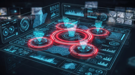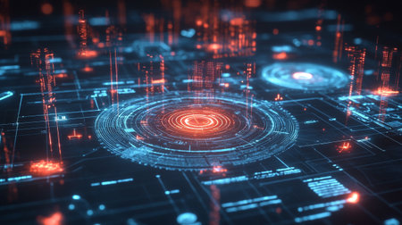 A complex digital interface showcases data visualization with holographic projections and glowing elements. The composition features a dark, technology-driven aesthetic with blue and red accents. This image could be useful in illustrating concepts related to data analysis, technology, or future innovation, suitable for various commercial applications.