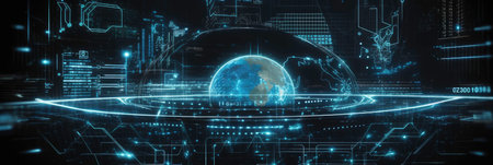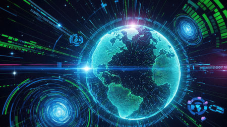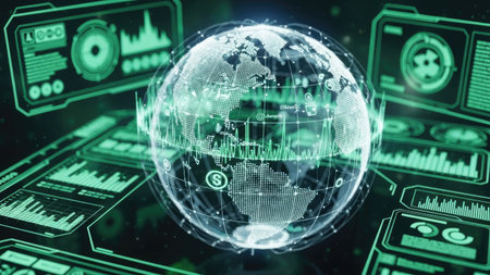 An illustration features a glowing digital globe at the center, surrounded by graphical user interface panels. Shades of green and blue create a futuristic atmosphere, suggesting data analysis or technology. The composition uses a centralized focus, hinting at global communication and technological advancement, suitable for various editorial and commercial applications.