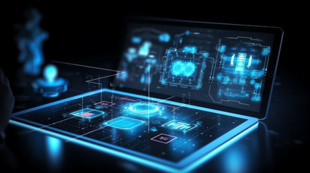 Multiple glowing blue holographic project data charts and circuit board in a dark, futuristic setting, showcasing technological advancement and information flow.