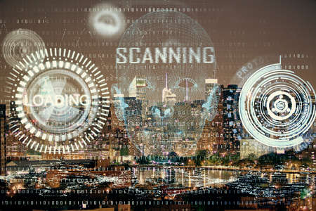 Double exposure of technology theme hologram and cityscape background. Concept of Hightech.